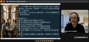 於工作坊的尾聲,華棟老師勉勵大家:「EMI全英語授課充滿挑戰,老師要有熱情,反覆調整課程,也要持續精進自我。」臺師大教學發展中心江學瀅主任則表示:「會講英文和會用英文教書是兩回事,期盼教師能以學生為本進行教學,持續推動EMI課程。」歡迎瀏覽臺師大EMI教學資源中心網頁,持續關注國外移地訓練資訊及EMI相關議題。(撰稿:華語117林洸含 )