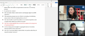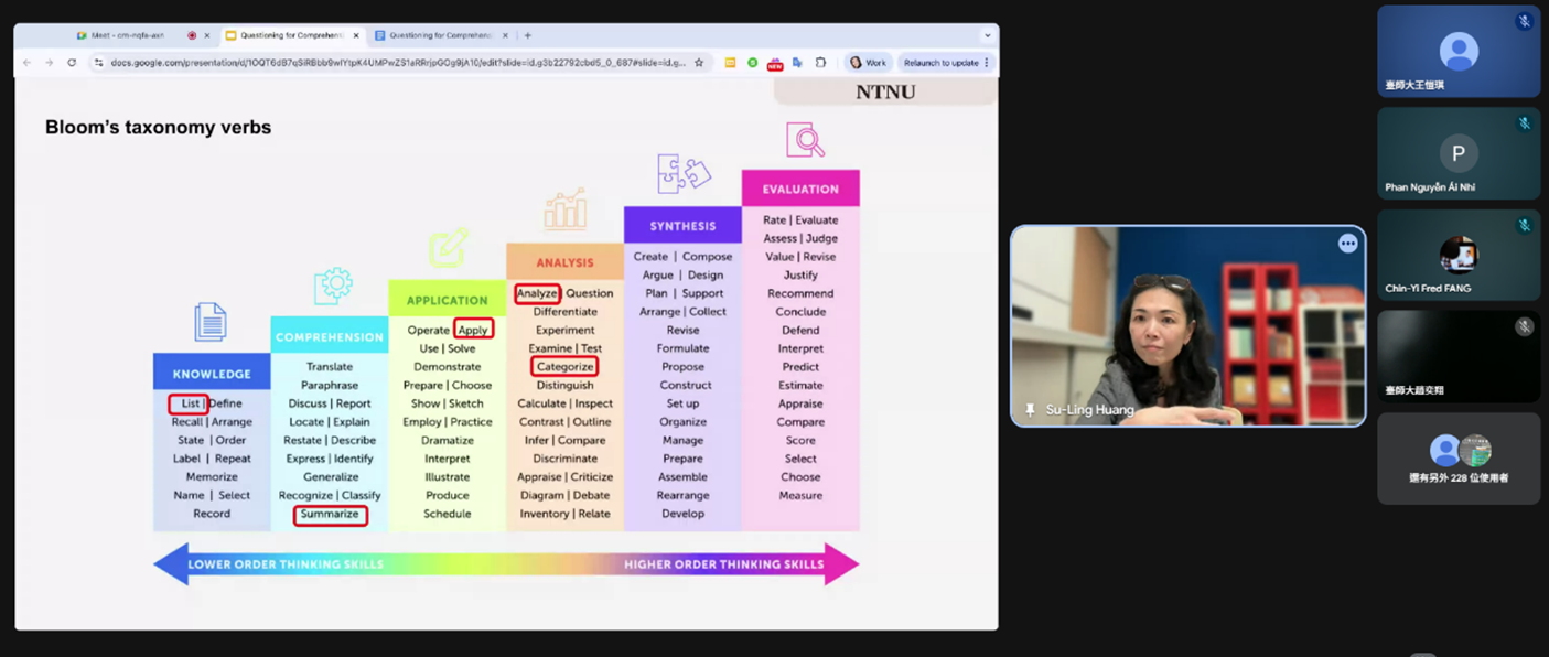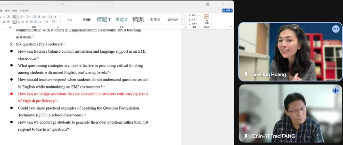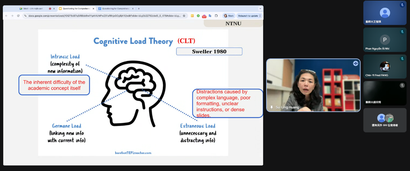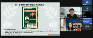 國立臺灣師範大學教學發展中心於115年3月24日舉辦「英語授課知能工作坊」,邀請Fulbright學術交流基金會顧問Su-Ling Huang,分享EMI授課中如何透過改善「提問品質」來提升「學習品質」,並探討如何有效降低學生在全英語學習環境中的認知負擔,進而提升學習成效,本場次吸引238人線上參與。