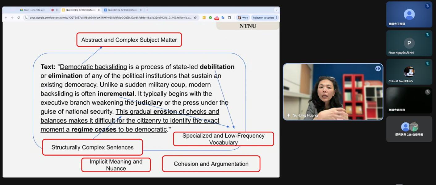活動尾聲,Su-Ling 顧問以一篇探討「民主倒退」的高難度文本為例,親自示範如何拆解字句,並且用提問的方式,引導學生理解其中的低頻單字與複雜句型。透過實際演練,與會者清楚看見語言鷹架的實作方式,讓學生不僅不會被生澀的學術術語所阻礙,反而能針對複雜議題進行實質且具有深度的討論。