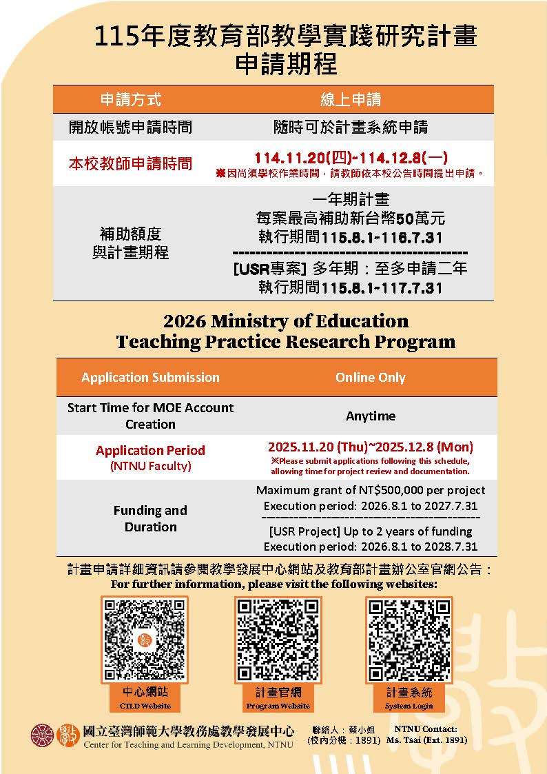 115年度教育部教學實踐研究計畫申請期程 2026 MOE Teaching Practice Research Program