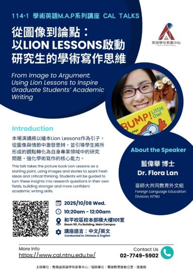 [轉知] 英語學術素養中心講座分享:10/8(三)從圖像到論點:以 Lion Lessons 啟動研究生的學術寫作思維