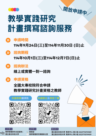[轉知]國立臺北科技大學-114年度教育部教學實踐研究計畫北區區域基地「教學實踐研究計畫撰寫諮詢服務」申請辦法