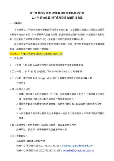 - 主題:114年度北區基地國立臺北科技大學跨校教師社群期末成果交流會暨共識會議