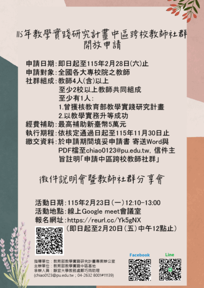 [轉知]靜宜大學-「教育部115年教學實踐研究區域基地計畫中區基地跨校教師社群」徵件申請辦法暨徵件說明會資訊