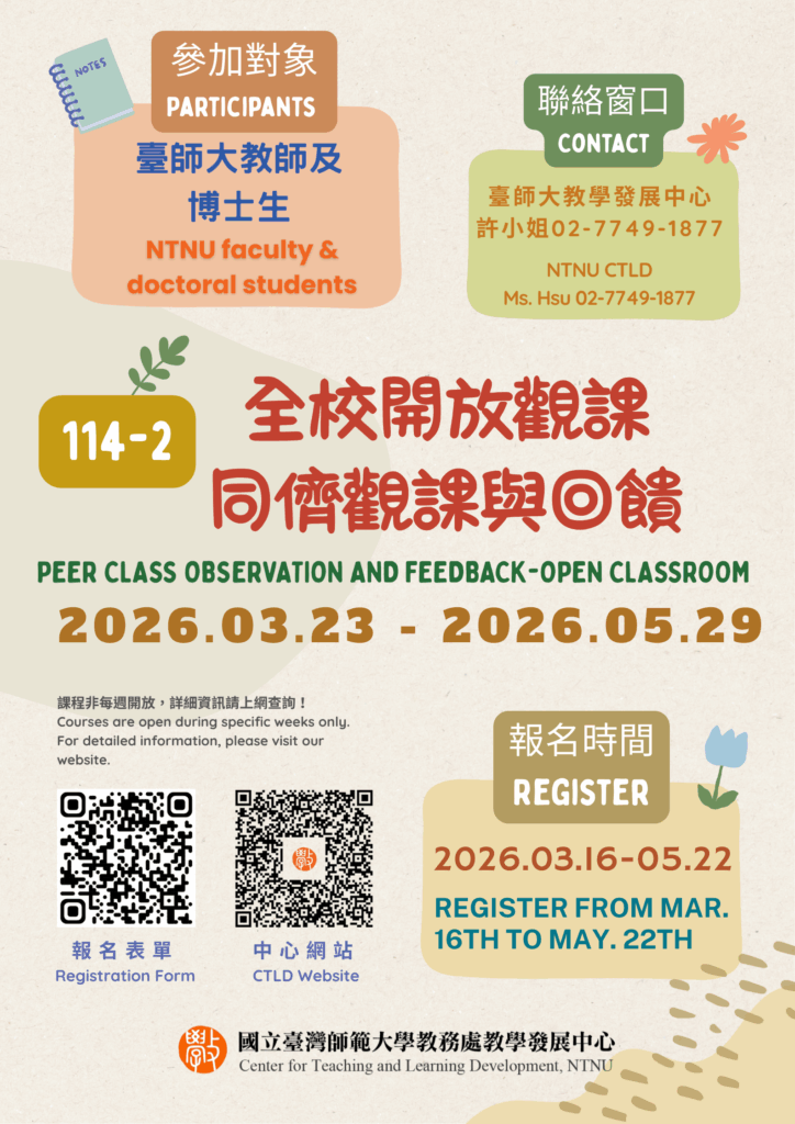 為了讓教師們能共學共享,在社群中獲得緊密的連繫,教學發展中心自105學年度起規劃推動「同儕觀課與回饋制度」,鼓勵教師透過參與彼此課堂並提供回饋,在專業與教學的建議下,構築跨領域的交流平台。鑑於多位參與「同儕觀課與回饋」制度師長的建議,我們期望觀課的共學共享經驗可以有更大平台的交流,在未來擬邀請曾參與計畫或有意願之師長開放教室,邀請觀課並進行交流互惠,以深根師大教學卓越的文化與精神。