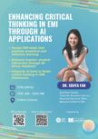 Enhancing Critical Thinking in EMI through AI Applications ♦時間: 12/10 (三) 10:30-12:00 ♦講者: 國立臺灣師範大學 范雅筑 教授 (學術語文中心專任教師/EMI教學資源中心副執行長) ♦地點: 線上 ♦內容: °設計促進分析與反思學習的 EMI 任務。 °透過 AI 回饋強化師生互動。 °整合 AI 工具以培養學生的批判性思考。 ⇒...