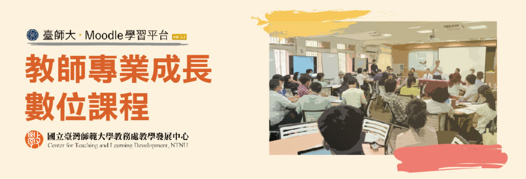 基於數位典藏與經驗傳承的期盼,教發中心於 Moodle 開設了「教師專業成長數位課程」,內容包含教發中心所舉辦的研習、座談活動記錄並重新後製剪接的影片,還有關於教學精進相關的各類課程,希望藉此提供臺師大教師豐富的數位資源,留下教學的歷程軌跡,並促進經驗傳遞與專業成長。